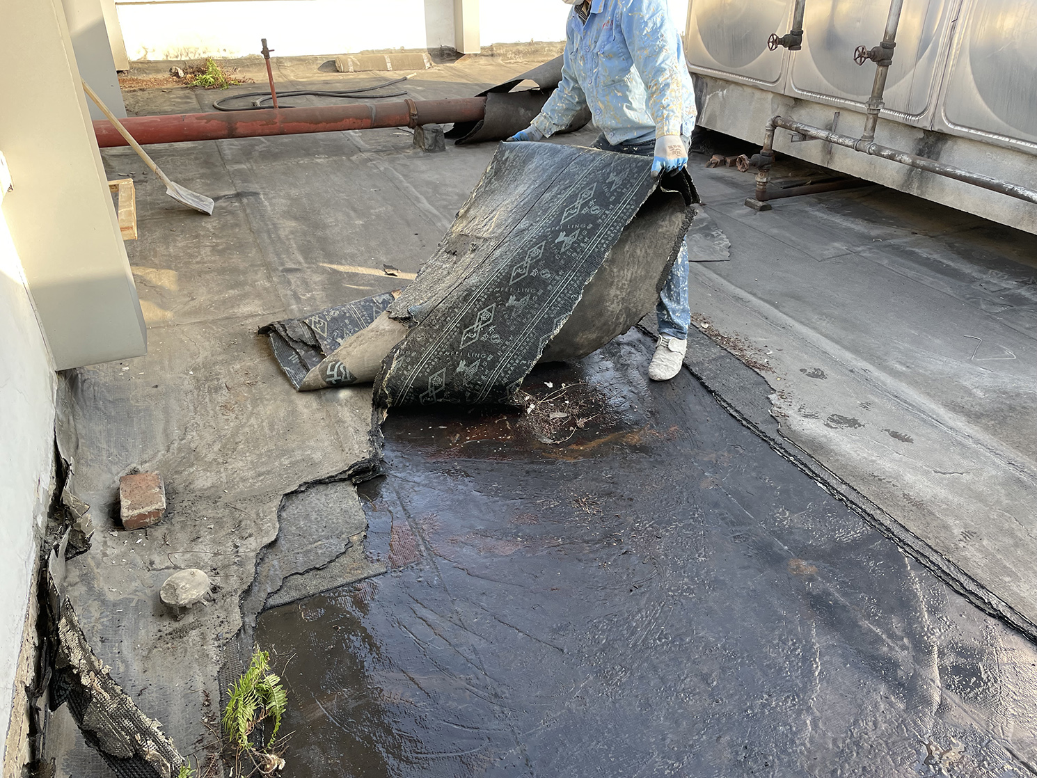SBS改性瀝青防水卷材作為最近二十年的最常用的屋頂防水卷材,在使用了一段時間的過程中,也逐漸顯現(xiàn)出了他的弊端,SBS改性瀝青防水卷材施工對屋頂基面的水分有要求,需要基面很干燥,但是實際情況是屋頂?shù)幕婧茈y達到SBS改性瀝青防水卷材施工要求的干燥程度,這樣的情況下屋頂鋪貼了SBS改性瀝青防水卷材之后,基面的水分在夏季高溫的情況下形成水汽累積在防水卷材下面,SBS改性瀝青防水卷材就與基面分開了,就是所謂的雨傘式防水層,整個屋頂防水卷材沒有問題的話就可以起到防水作用,但是在以后由于地震或者其他因素,個別地方防水層被損壞了之后,水從這個部位漏到防水卷材下面去了,水就在防水卷材下面四周到處擴散,導(dǎo)致屋頂防水卷材下面到處都是水,防水卷材的防水作用就完全失去了防水作用。(下面就是屋頂原來做的SBS改性瀝青防水卷材,漏水了之后揭掉防水卷材之后看到防水卷材下面水到處竄)