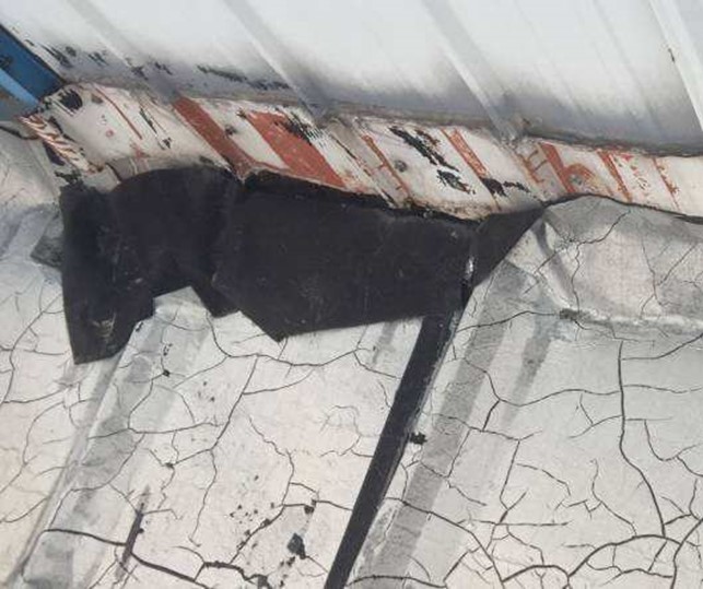 彩鋼頂表面采用SBS改性瀝青防水卷材施工的,兩年后改性瀝青防水卷材出現(xiàn)開裂情況嚴(yán)重