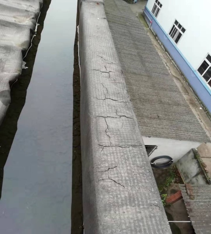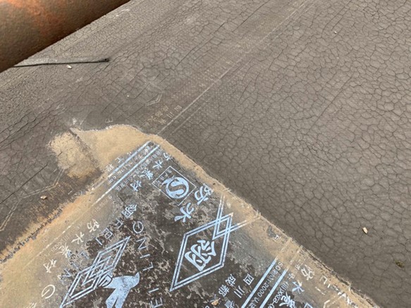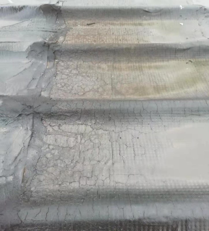 ①針對彩鋼瓦屋面防水,市面上很多人采用的SBS改性瀝青防水卷材施工處理,但是SBS改性瀝青防水卷材是非外露材料,是不能裸露使用的,這彩鋼頂表面由于夏季溫度比混凝土溫度還高,所以改性瀝青防水卷材做在彩鋼瓦表面基本兩三年后就會被曬得開裂,以下照片可以看出彩鋼瓦表面瀝青防水卷材很快就老化開裂。