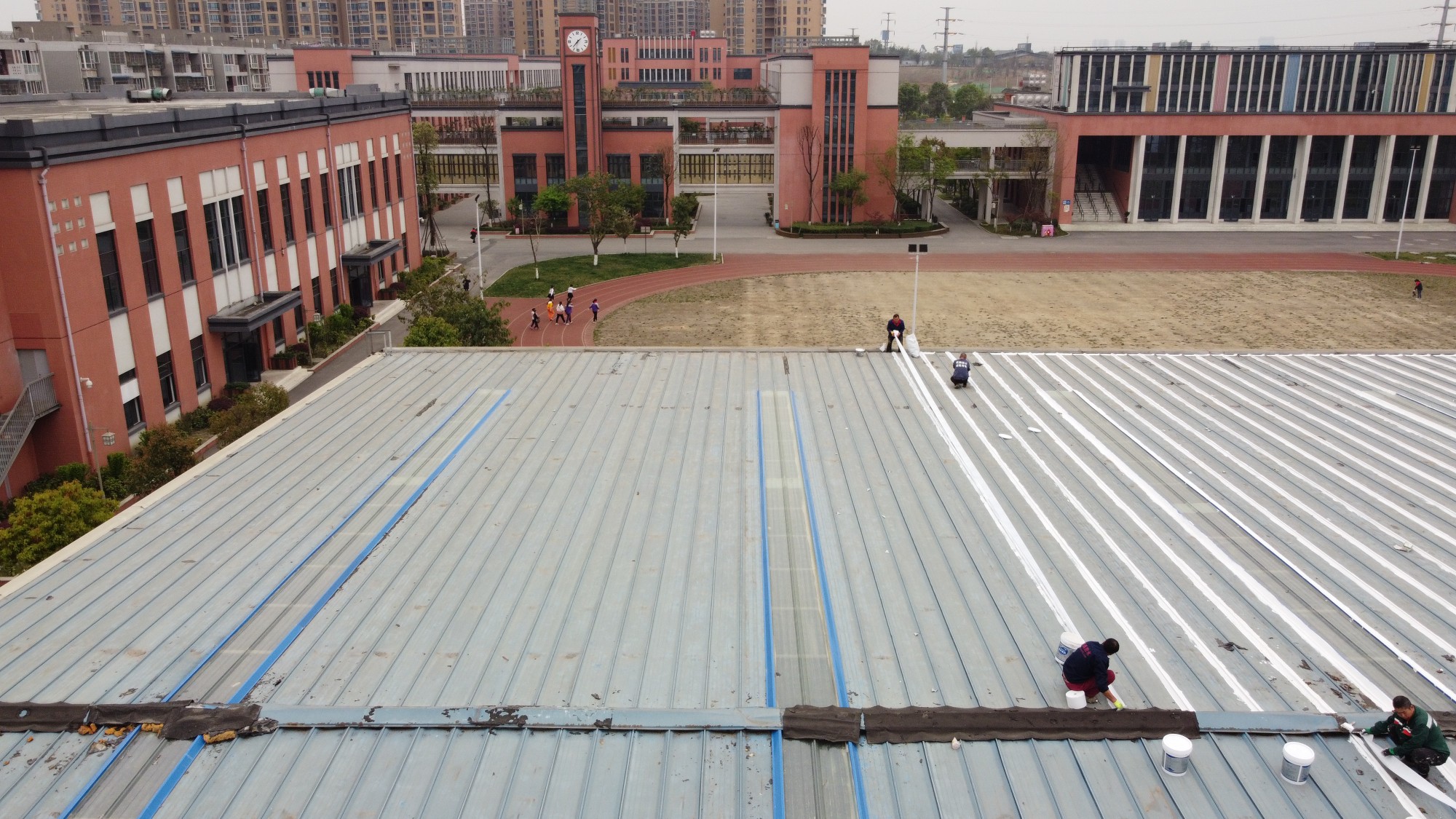 成都市新都區下石橋路啟陽五龍山園區鋼結構彩鋼頂屋面防水補漏由成都蜀禹建筑防水工程有限責任公司施工,采用的蜀禹SYR金屬屋面專用防水涂料配合專用縫織聚酯布進行施工處理的,施工處理后具有防水防腐等多重功能。