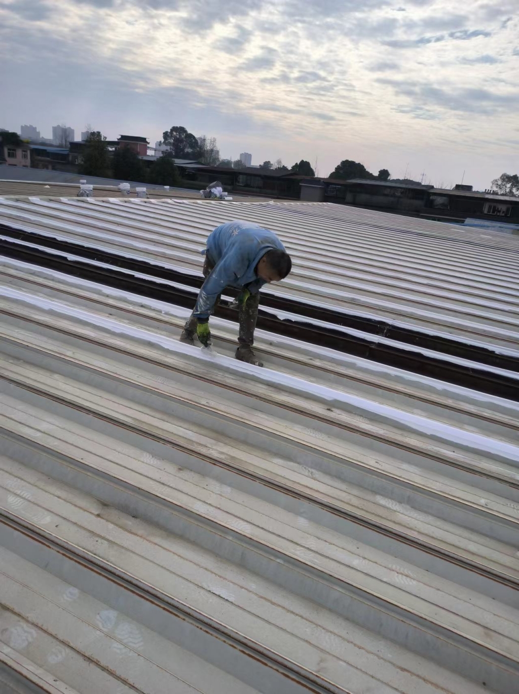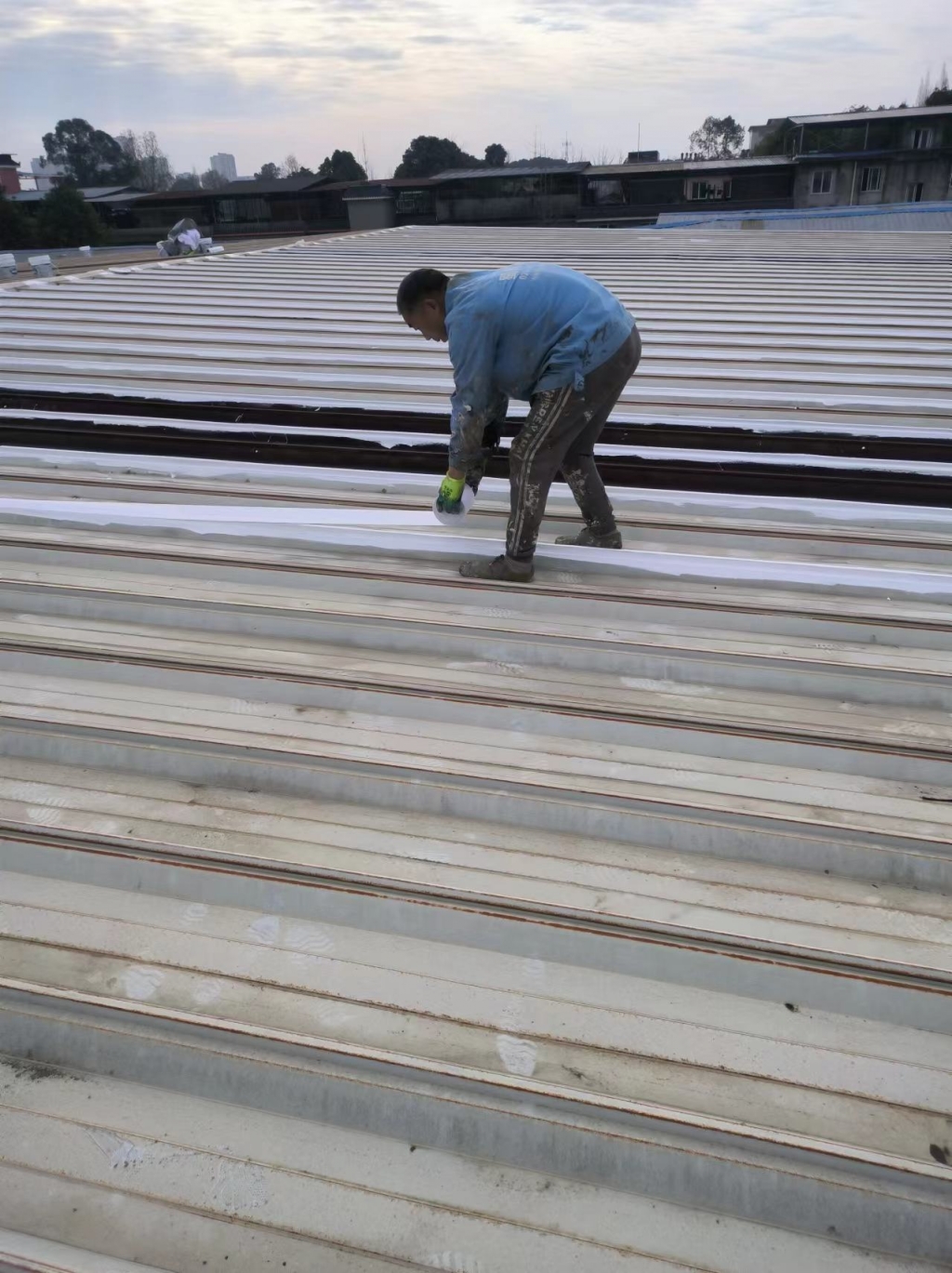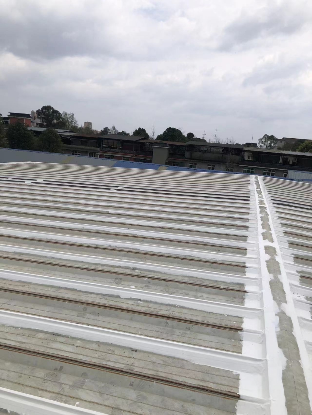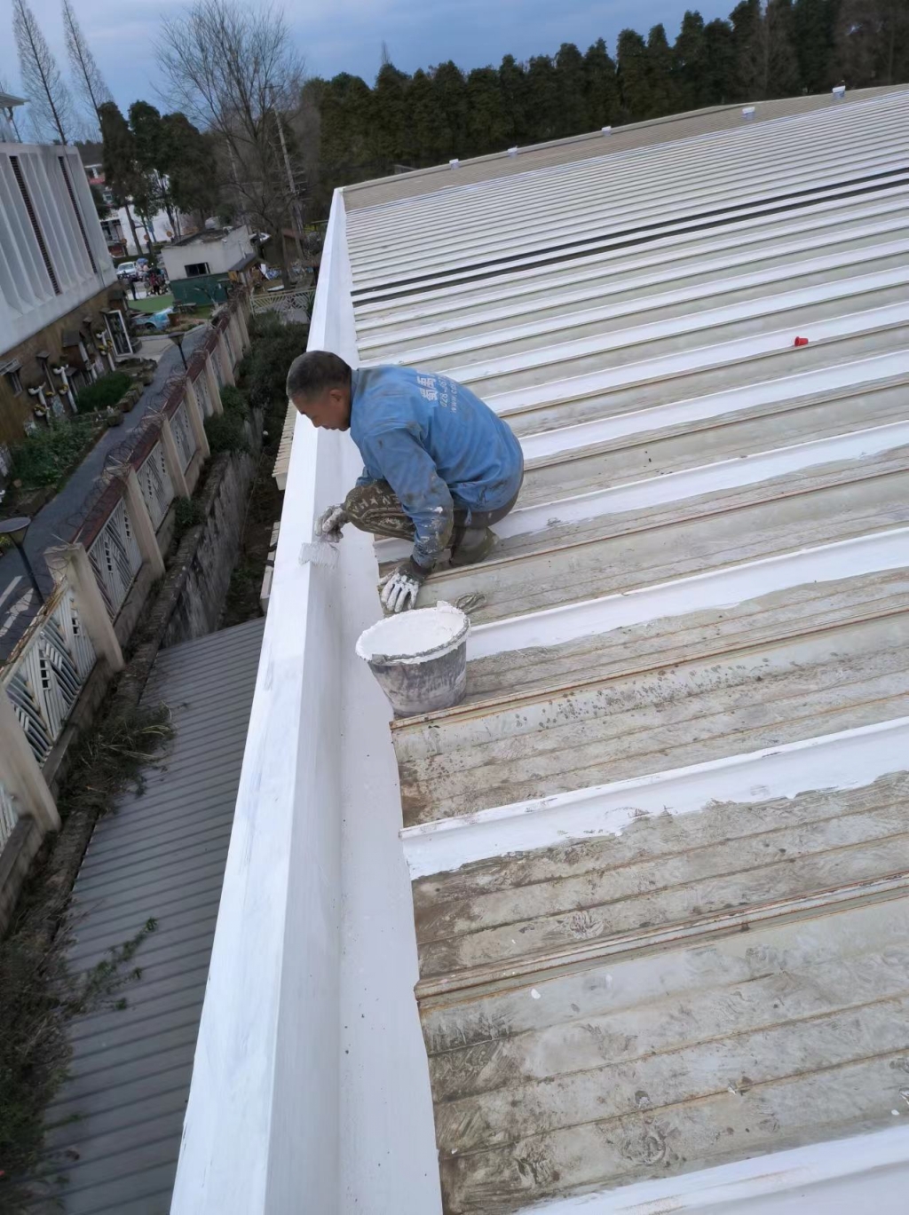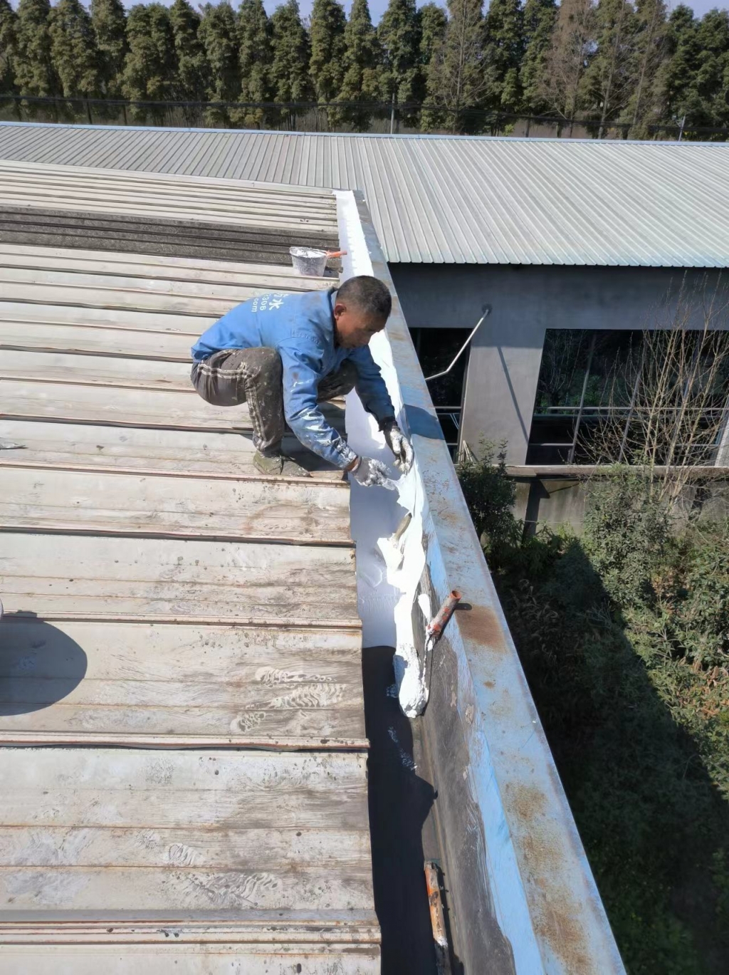 在天溝部位的處理上,成都蜀禹建筑防水工程有限責任公司同樣采用了SYR金屬屋面專用防水涂料進行滿涂刷。對于天溝內銹蝕嚴重的地方,公司首先采用彩鋼板進行修補,然后在生銹的地方涂刷免除銹納米固銹劑進行基面固銹處理。這一步驟不僅有效去除了銹蝕,還為后續的防水防腐處理奠定了堅實的基礎。