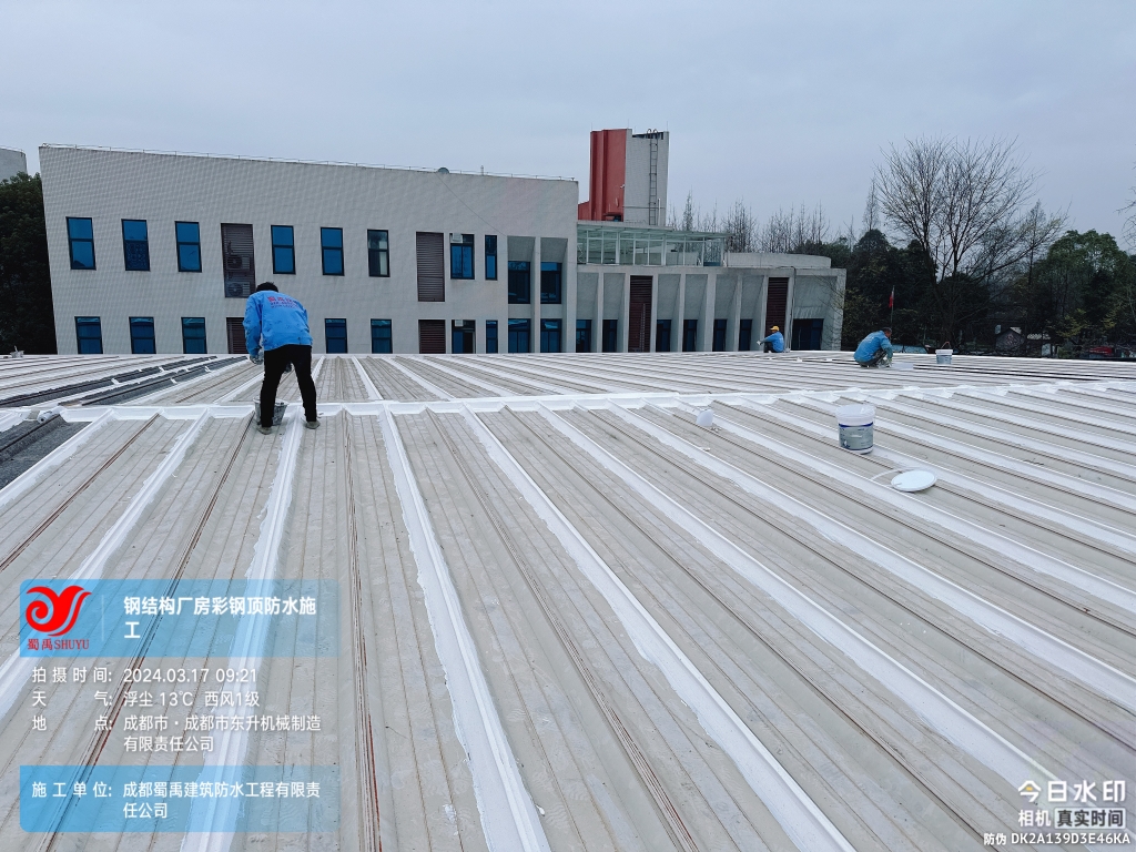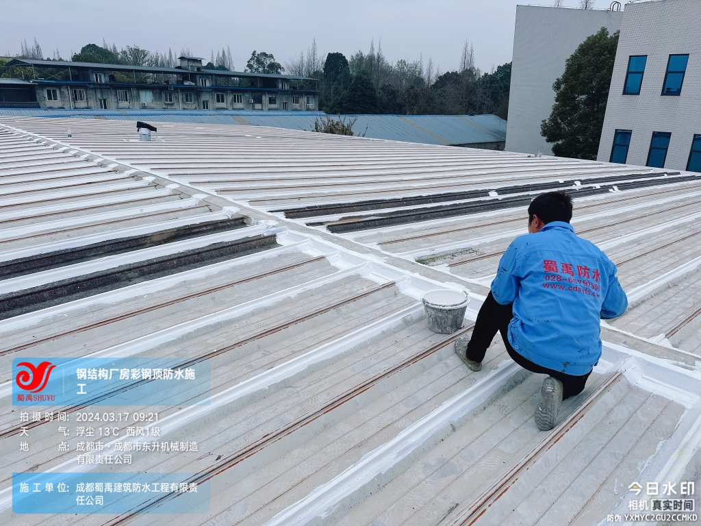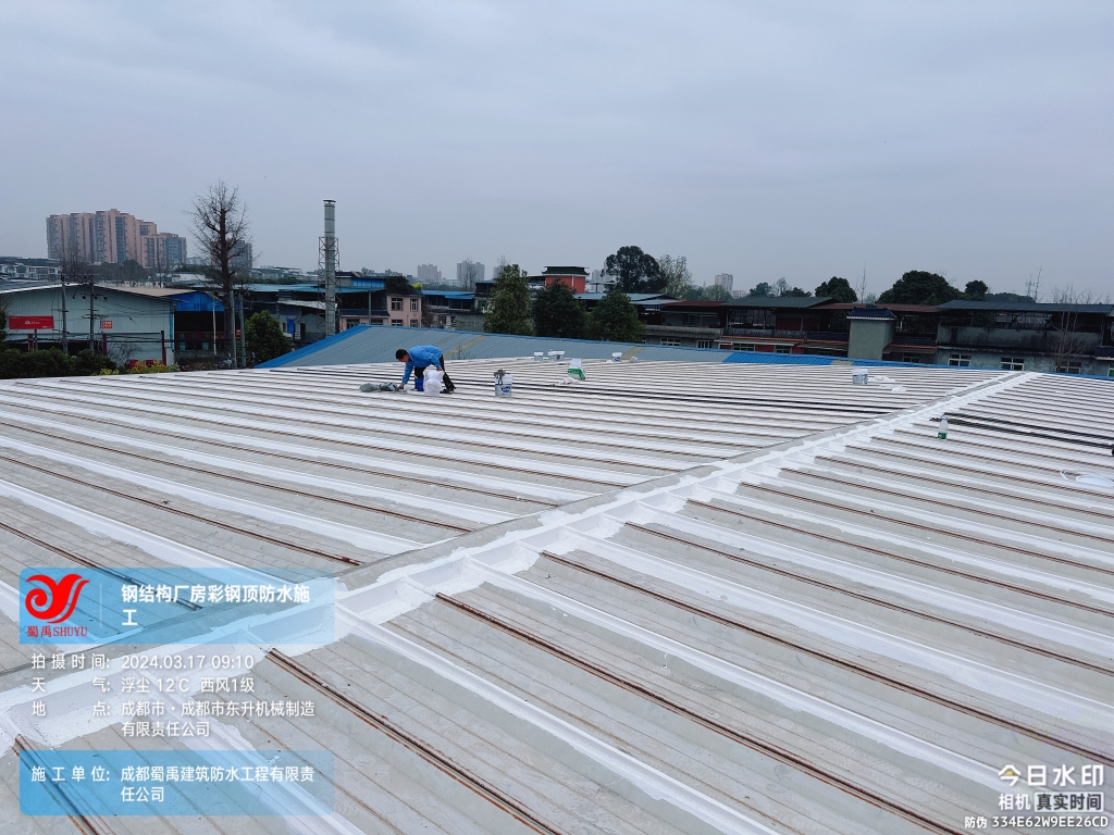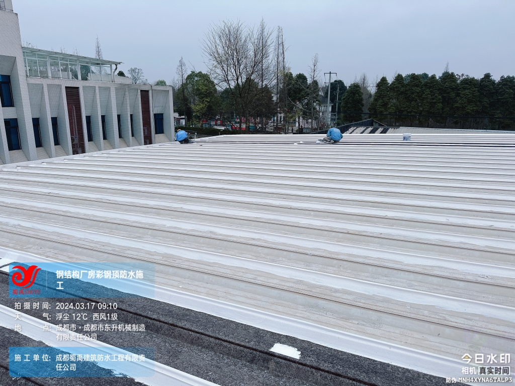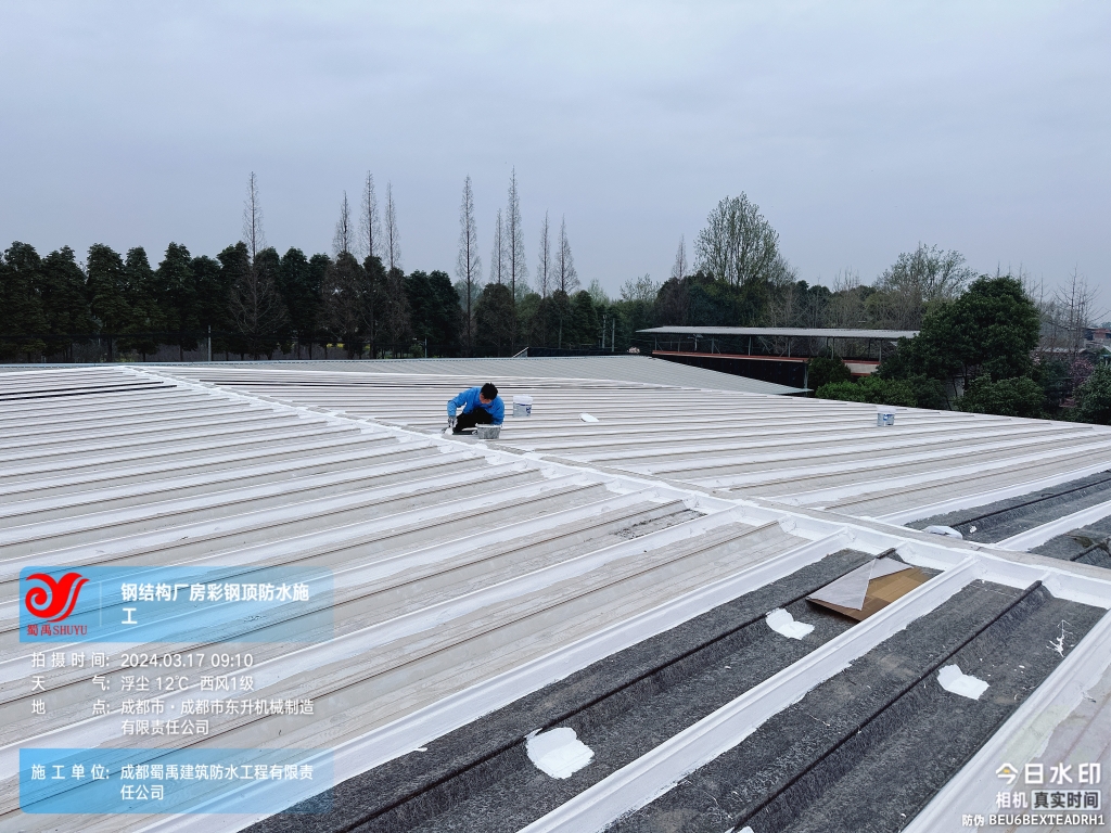 近日,成都蜀禹建筑防水工程有限責任公司成功完成了成都市東升機械制造有限責任公司位于溫江區廠房的彩鋼頂及天溝防水補漏工程。此次工程旨在解決廠區內廠房彩鋼頂屋頂表面的彩鋼瓦接縫、固定螺釘、天溝等部位的防水問題,確保廠房的防水性能得到有效提升。