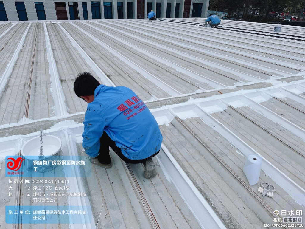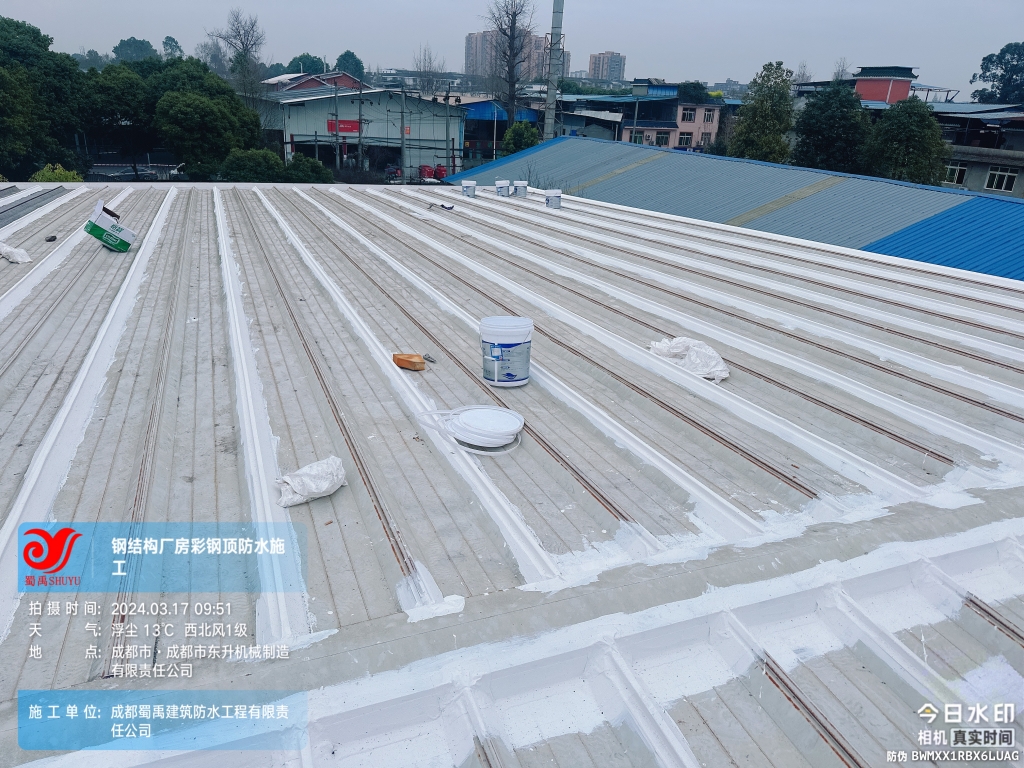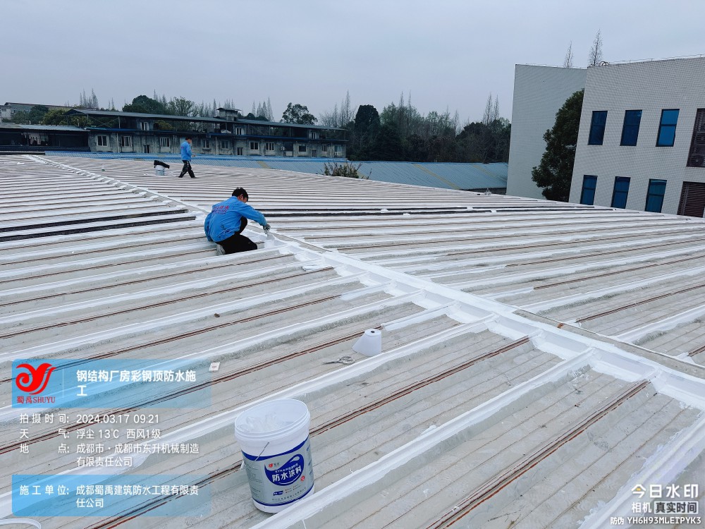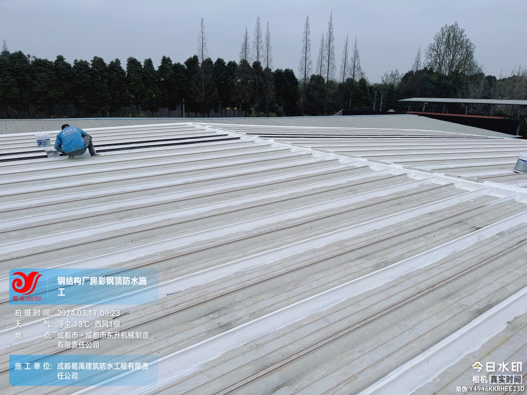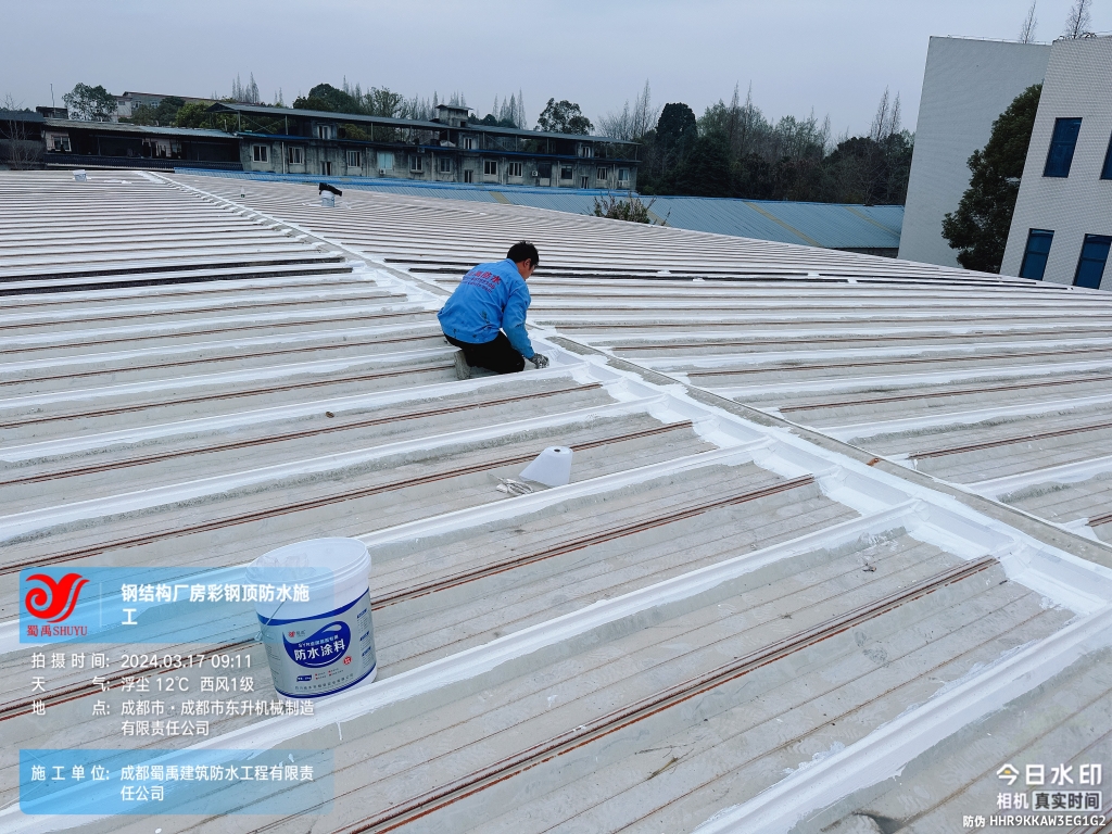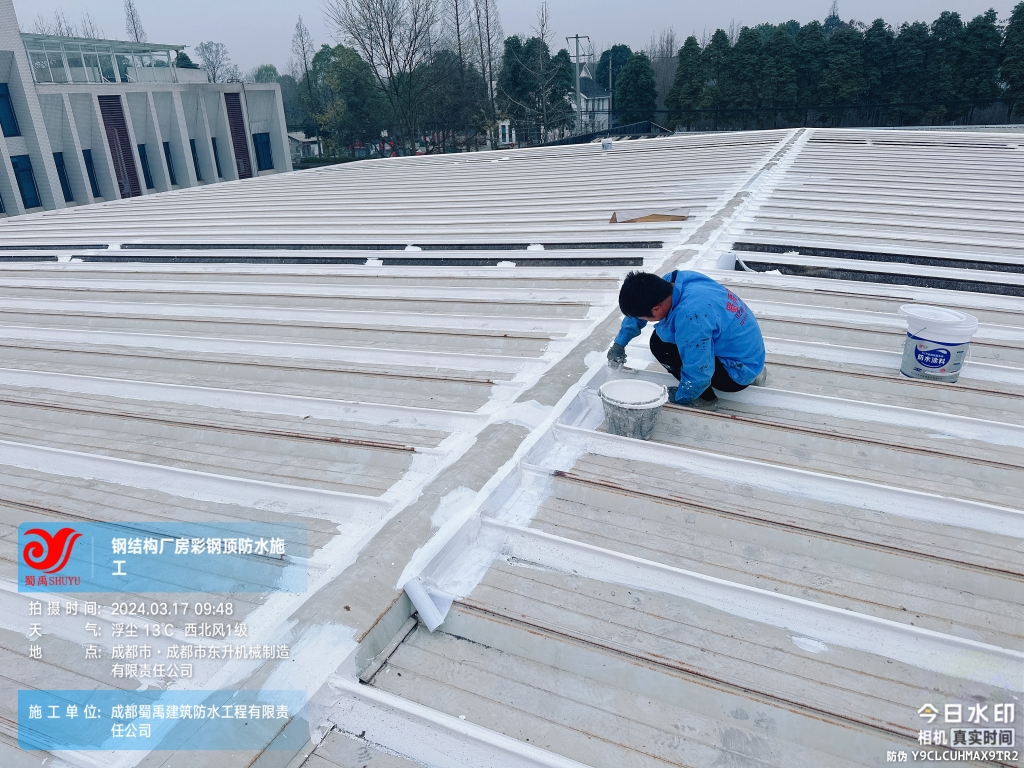 近日,成都蜀禹建筑防水工程有限責任公司成功完成了成都市東升機械制造有限責任公司位于溫江區廠房的彩鋼頂及天溝防水補漏工程。此次工程旨在解決廠區內廠房彩鋼頂屋頂表面的彩鋼瓦接縫、固定螺釘、天溝等部位的防水問題,確保廠房的防水性能得到有效提升。