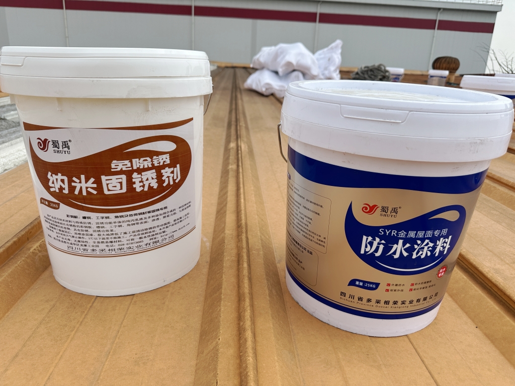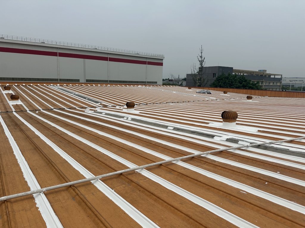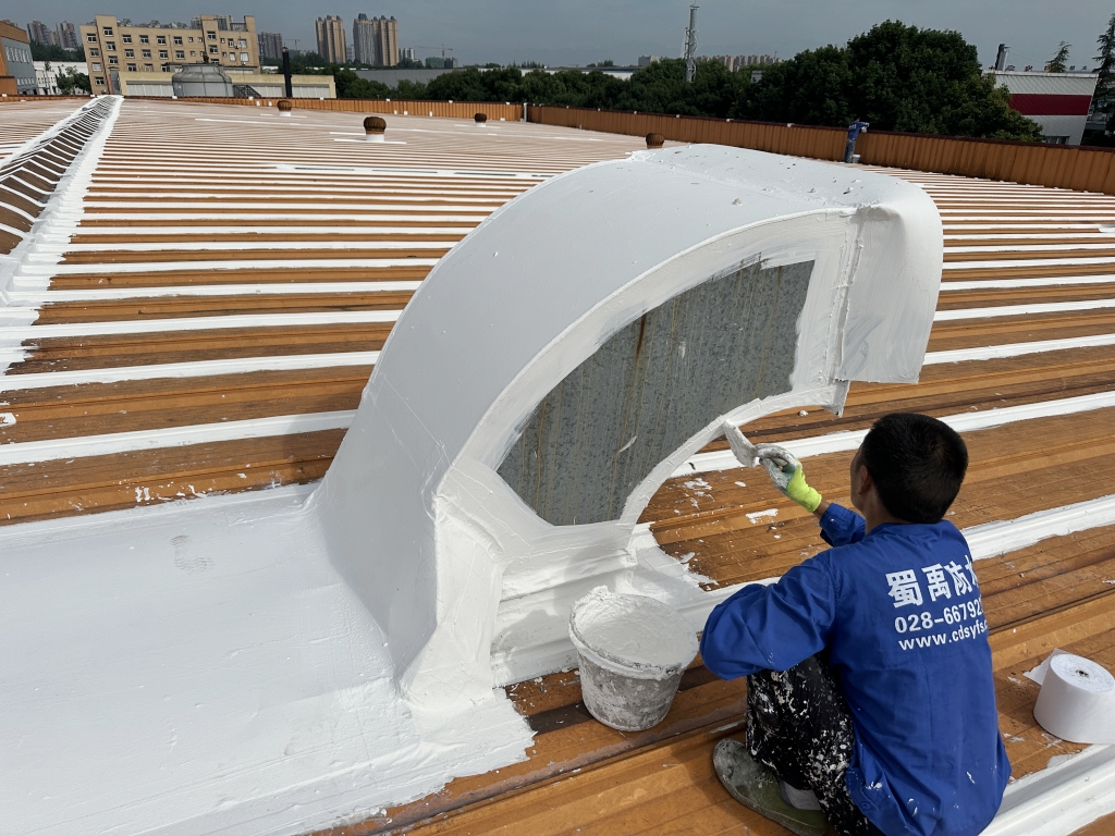 針對(duì)這一復(fù)雜情況,成都蜀禹制定了科學(xué)周密的防水施工方案。我們選用了SYR金屬屋面專(zhuān)用防水涂料,該涂料具有優(yōu)異的耐候性、粘結(jié)力和彈性,能夠有效抵御因金屬熱脹冷縮產(chǎn)生的應(yīng)力變化,確保防水層的持久穩(wěn)定。同時(shí),結(jié)合縫織聚酯布進(jìn)行“一布三涂”的施工工藝,即先在縫隙處鋪設(shè)一層縫織聚酯布以增強(qiáng)防水層的抗拉強(qiáng)度,再在其上涂刷三層防水涂料,形成一道堅(jiān)不可摧的防水屏障。